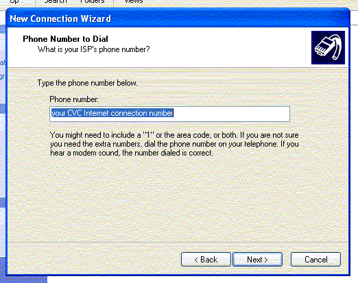 example below). 10.) In the "Phone Number to Dial" screen, "Phone Number" field, enter: the connection number ( #1), shown on page 1 of these instruction sheets, then click the "Next" button (see example below). 11.) In the "Internet Account Information" screen, complete the following (example shown below).