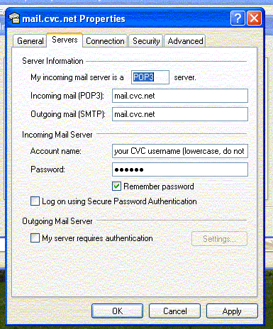 13.) At the top of the" mail.cvc.net Properties" window, click on the "Servers" tab. In the "Servers" screen, complete the following (sample screen below):